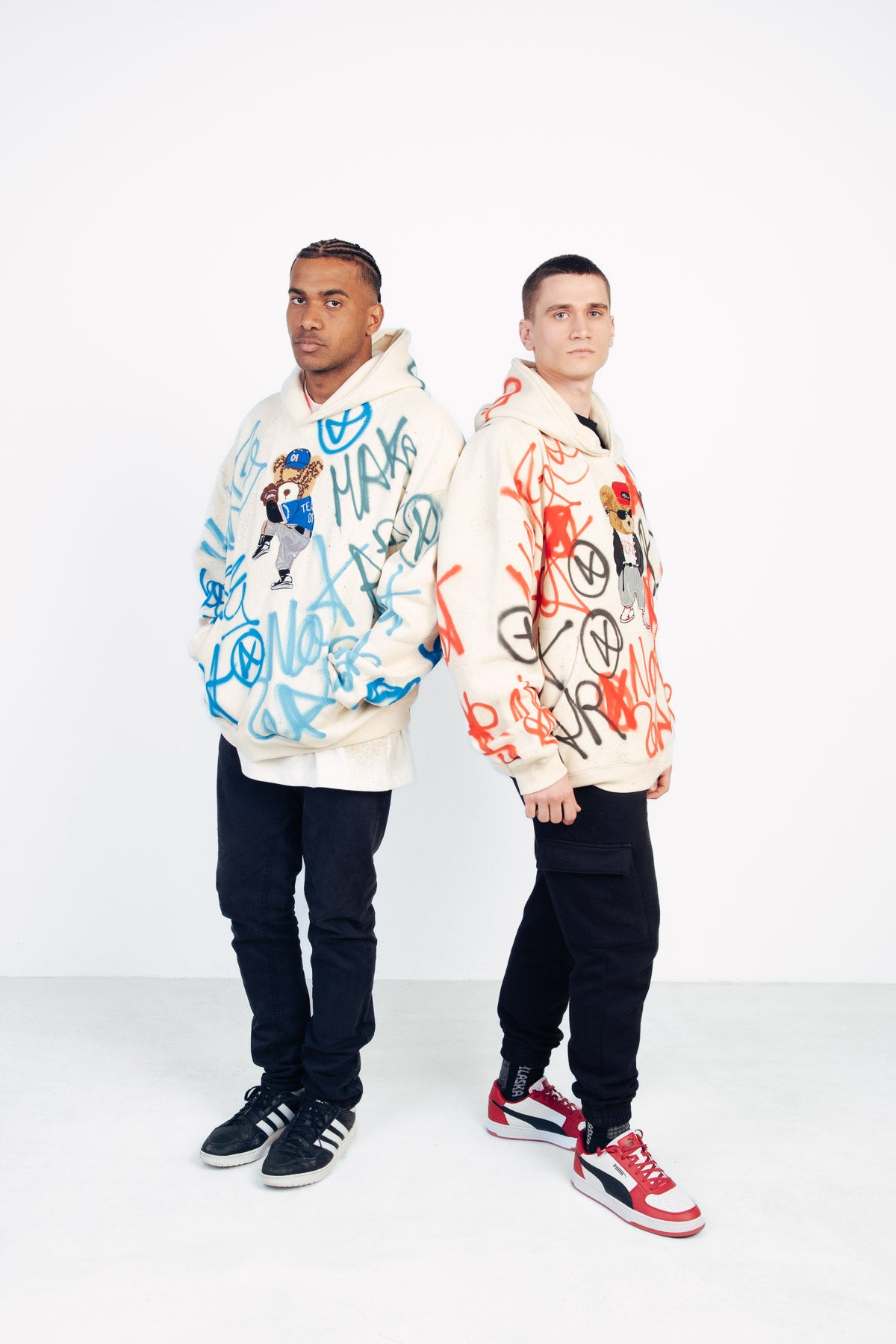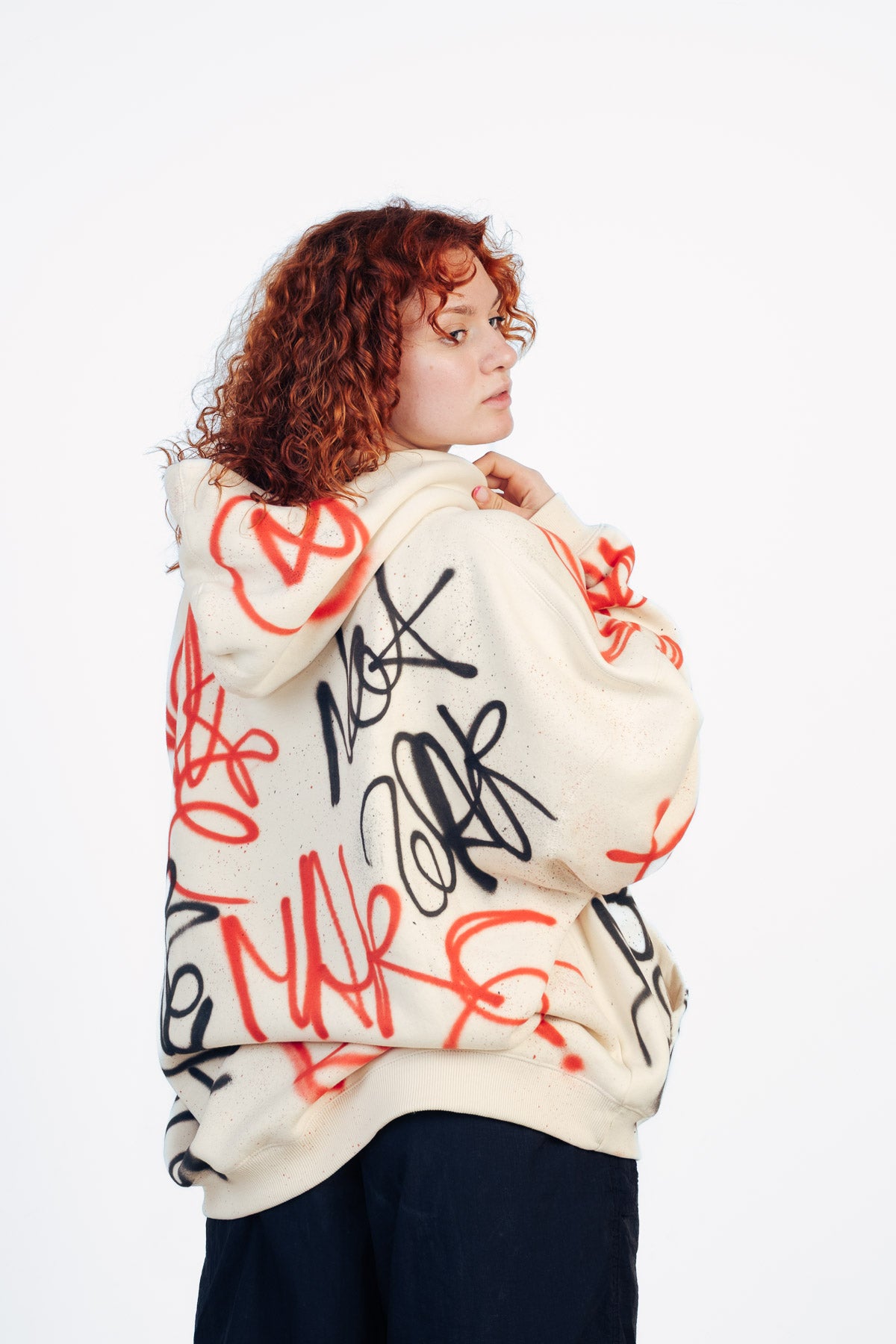 Sudadera beis con graffiti en negro y rojo y un parche 3D de oso.